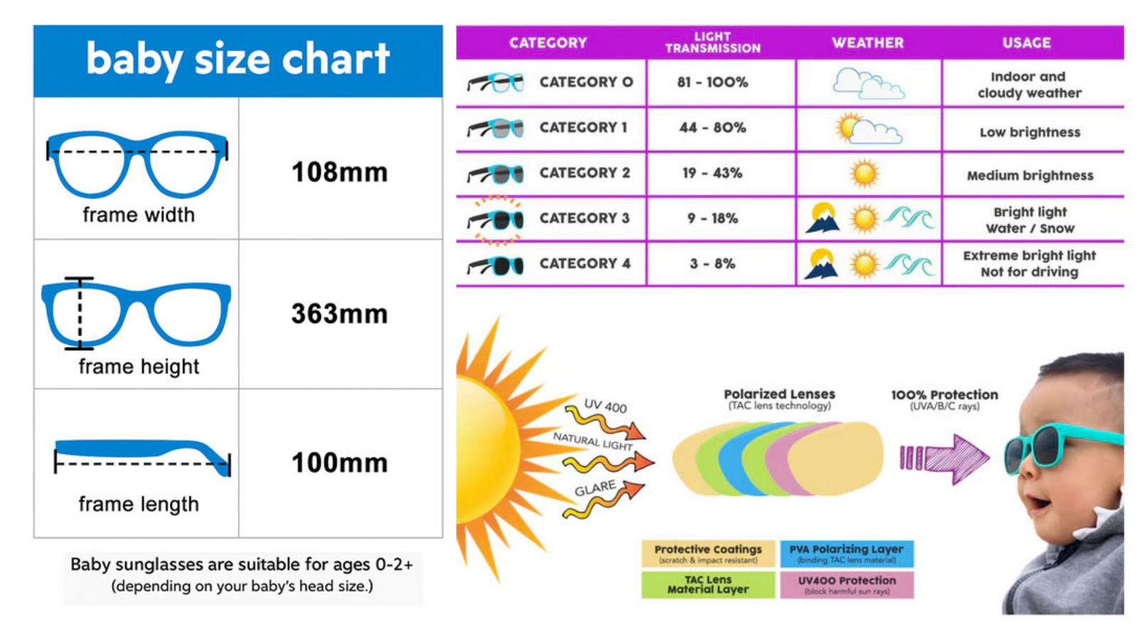 Good question, whilst we provide sunglasses for most babies, you will find the size guide helpful below for peace of mind.